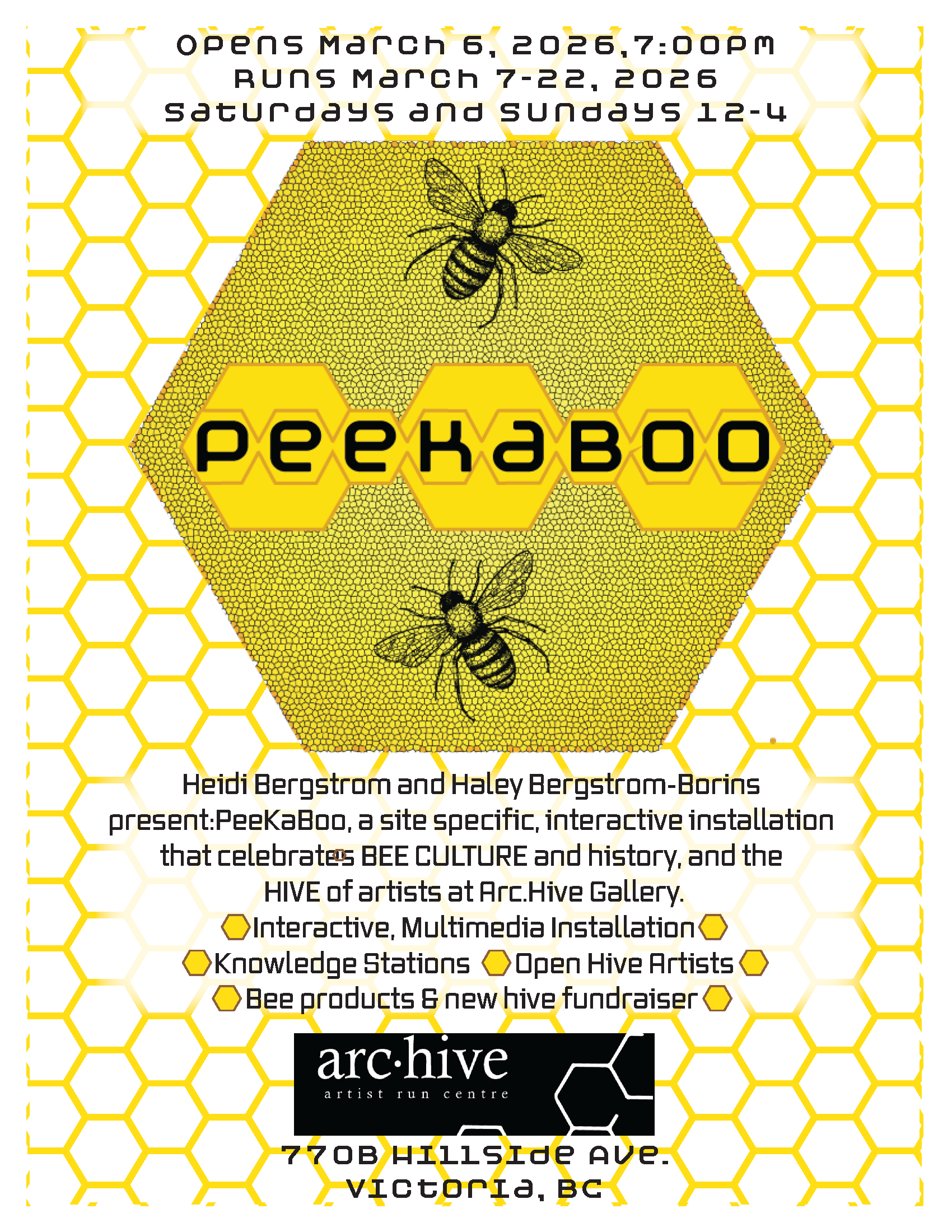 Heidi Bergstrom and her daughter Haley Bergstrom-Borins present PeeKaBoo, a site specific, interactive installation that celebrates BEE CULTURE and history, and the HIVE of artists at Arc.Hive Gallery. PeeKaBoo consciously references and works in relation to the gallery’s own identity and play on the word ARCHIVE as Arc.Hive - whereby the gallery is the centre of the hive of studio artists. PeeKaBoo also seeks to decolonize bees by examining current practices in industrialized bee keeping, the imposition of colonial structures on bees and bee history, and restorying bee narratives.